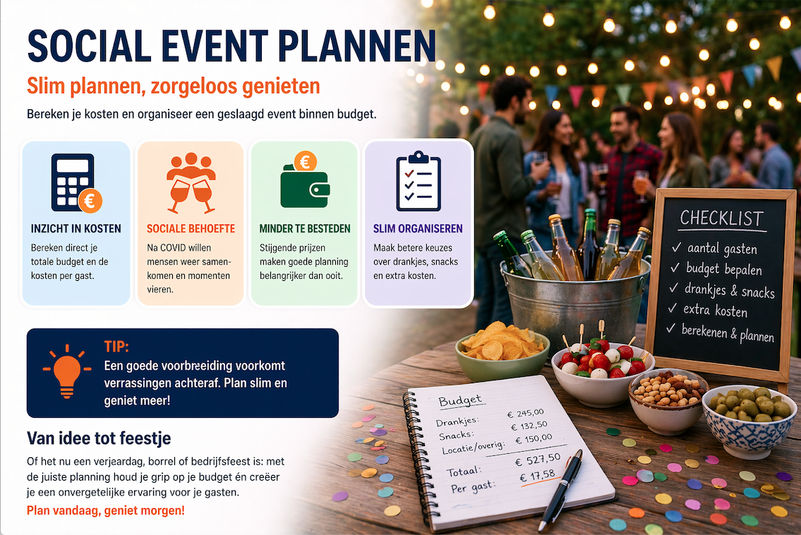 Een verjaardag, bedrijfsborrel of tuinfeest organiseren lijkt op het eerste gezicht vooral leuk en spontaan. Toch merken steeds meer mensen dat het plannen van een sociaal event tegenwoordig een stuk complexer is dan een paar jaar geleden. Door stijgende prijzen, hogere vaste lasten en economische onzekerheid is het budget vaak beperkter dan vroeger. Tegelijkertijd is de behoefte aan sociale bijeenkomsten juist groter dan ooit.